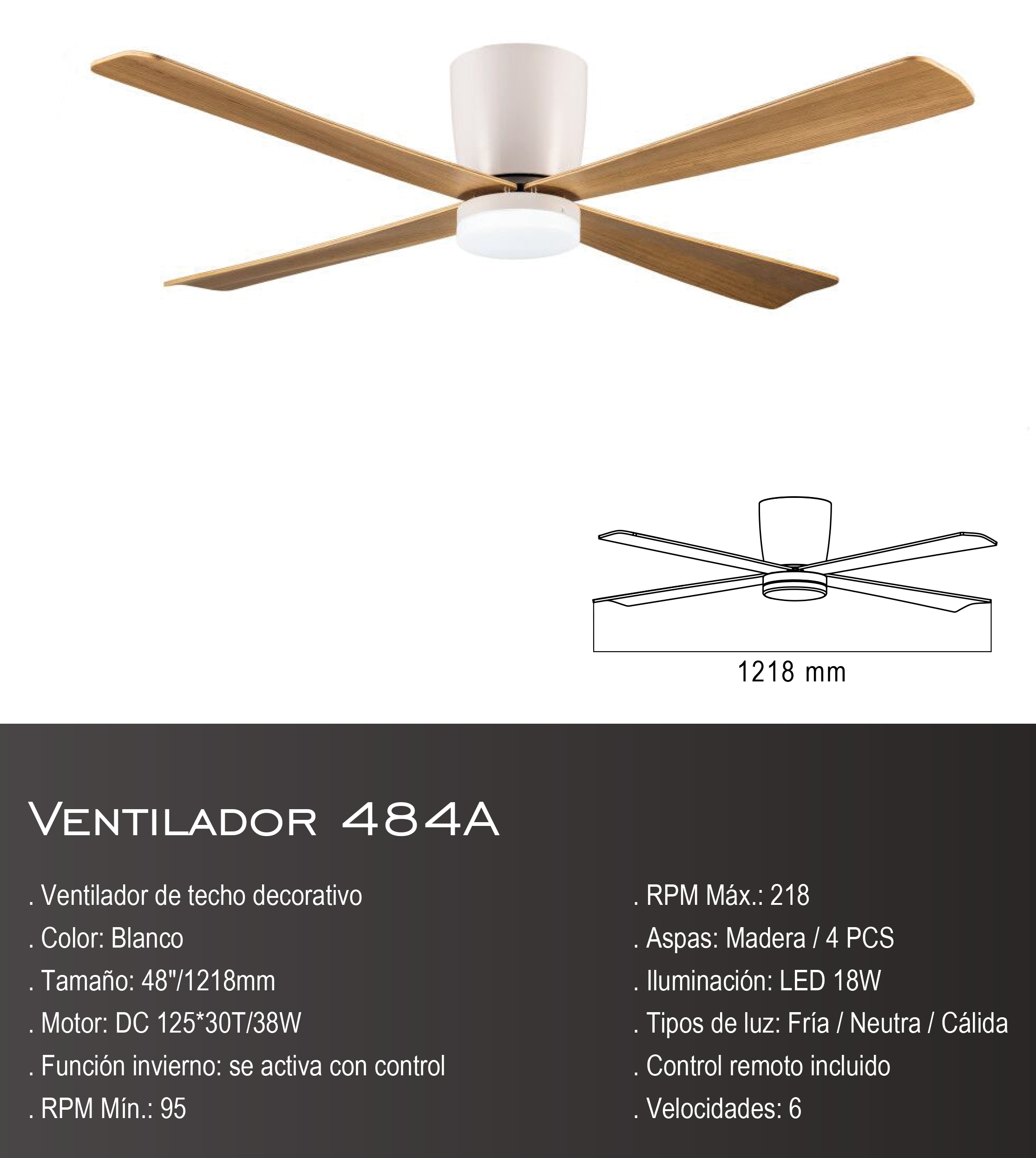 VENTILADOR DE TECHO DE DISEÑO CON LUZ INCORPORADA 18W CON SISTEMA DE 3 COLORES ( CÁLIDO, NEUTRO, FRIO ) Y 6 VELOCIDADES CON CONTROL REMOTO